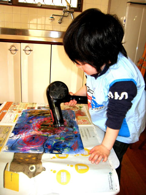 ドライヤーで乾燥中 クレパスと水彩で制作 じっくり観察しましょう!