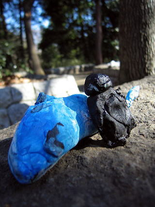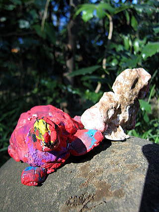 紙粘土の作品を森へ持って行き、一番かっこよく見える場所を探して写真でパチリッ!